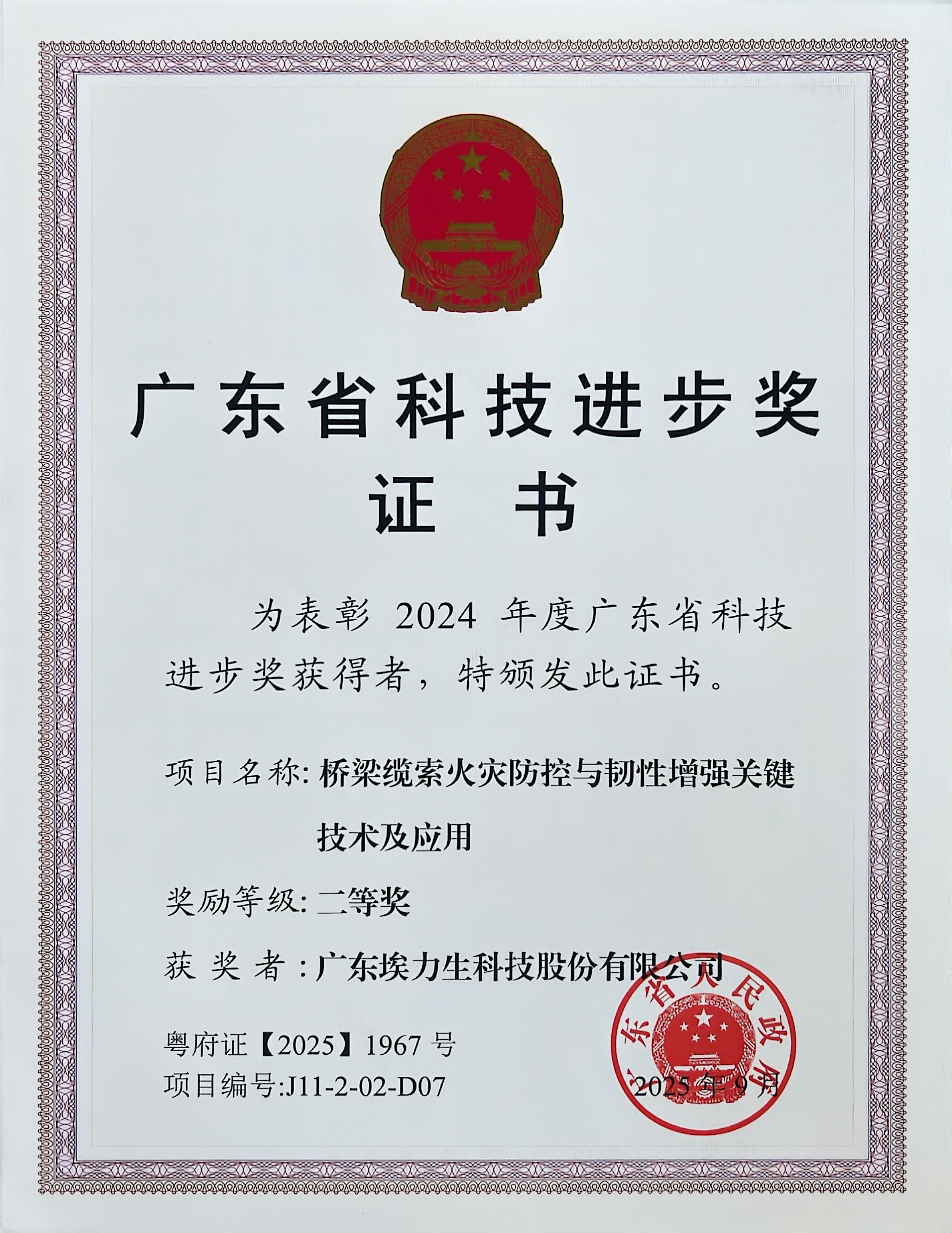 广东省科技进步奖 桥梁缆索火灾防控与韧性增强关键技术及应用